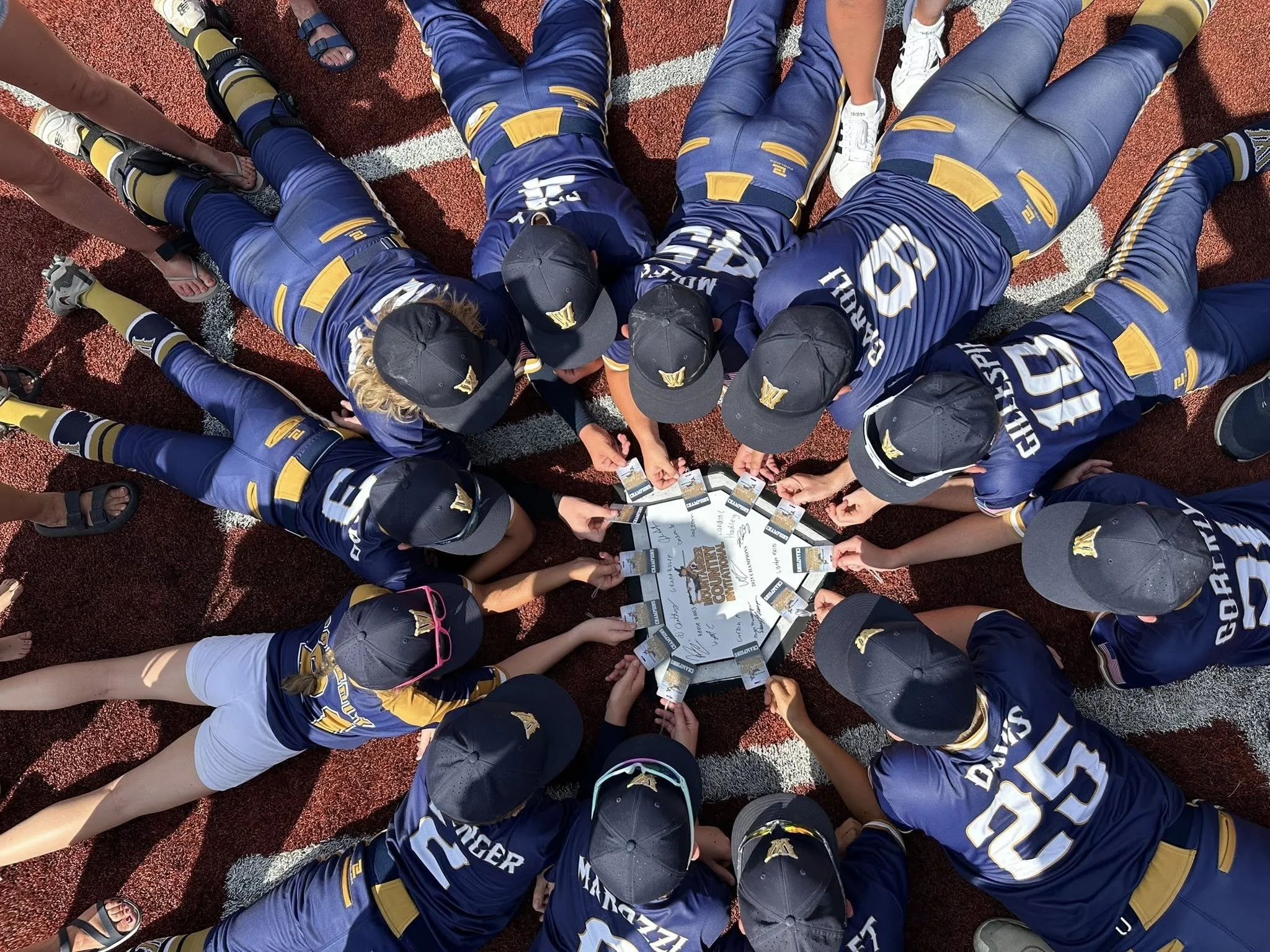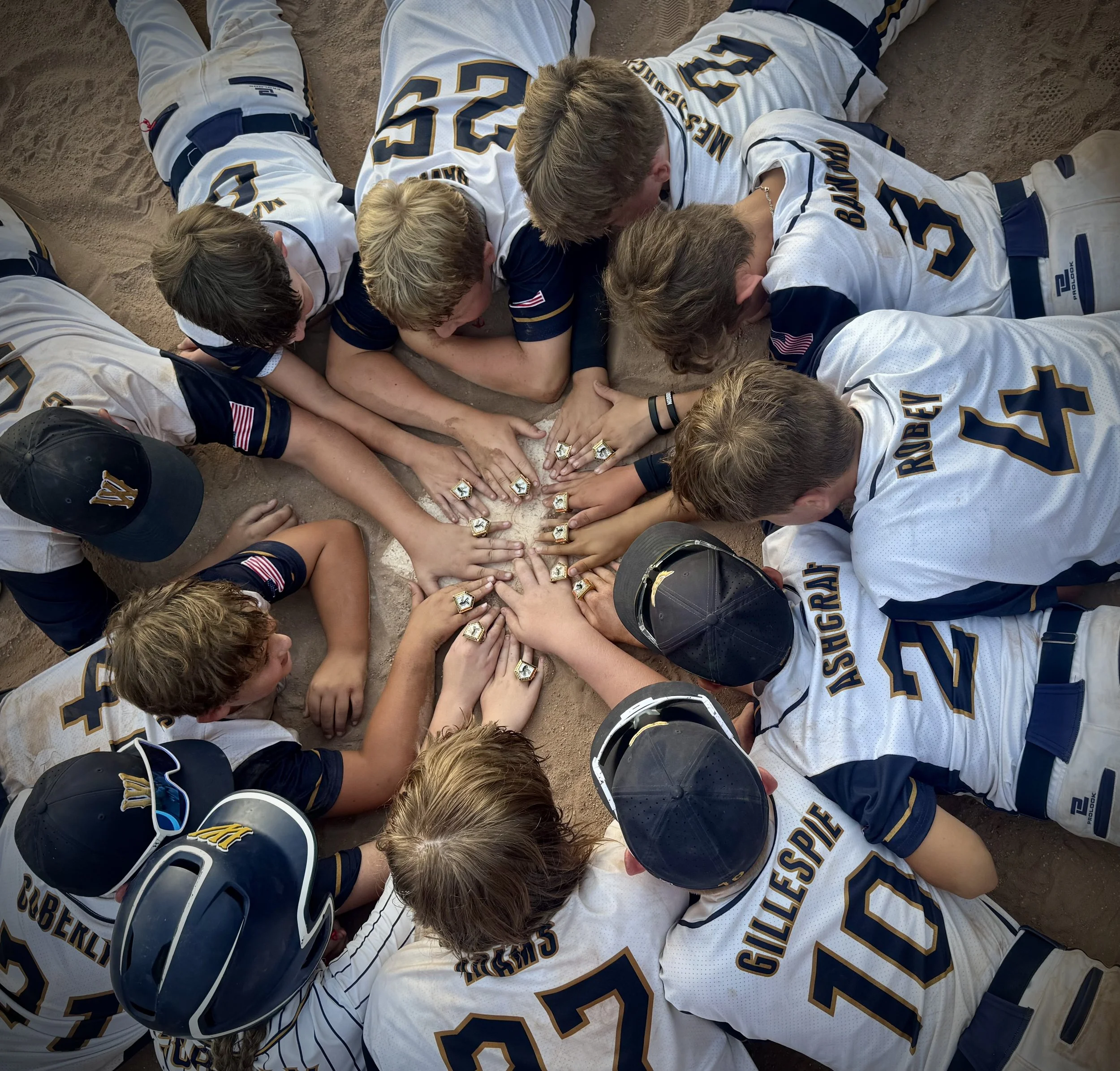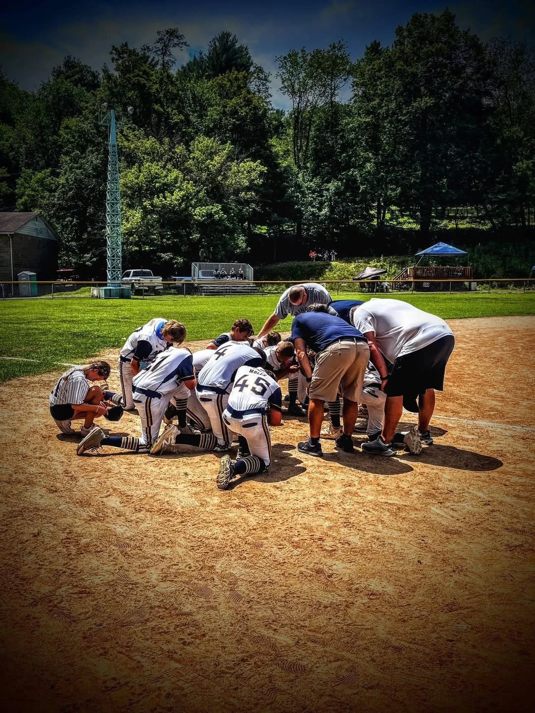A heartfelt moment as the 12U Miners gather in a tight huddle, heads bowed in prayer, seeking strength and unity before stepping onto the field.